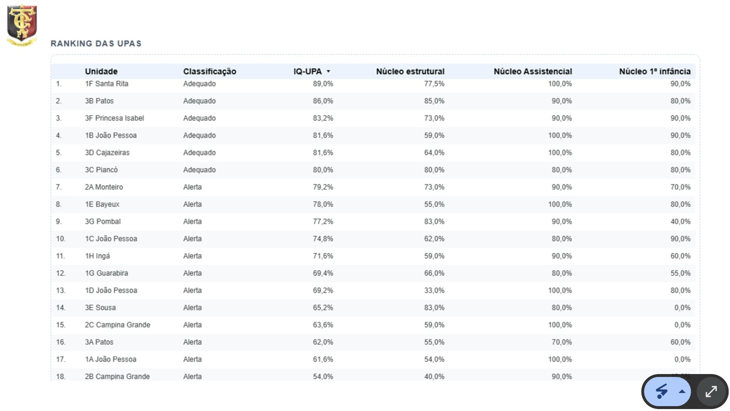 Nenhuma unidade alcançou 95% de conformidade, índice necessário para classificação exemplar. O melhor desempenho foi da UPA de Santa Rita, com 89%, considerada adequada. Já o menor índice foi registrado pela UPA 2B de Campina Grande, com 54%, classificada em nível crítico.