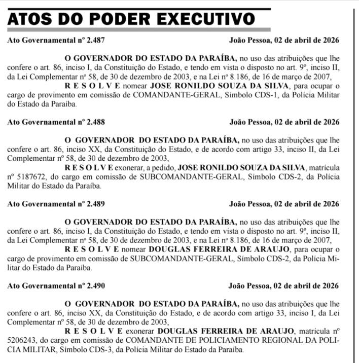 Em atos publicados no Diário Oficial desta sexta-feira, 03 de abril de 2026, o governador do Estado da Paraíba, Lucas Ribeiro, oficializou a nomeação dos novos comandantes da Polícia Militar do Estado.