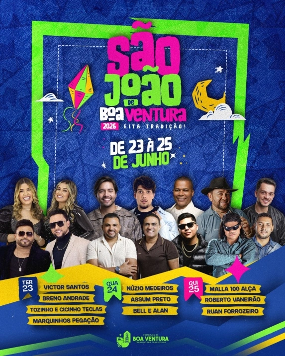 Com uma proposta que equilibra tradição, valorização cultural e entretenimento, a festividade junina de Boa Ventura em 2026 reafirma seu papel como o mais tradicional São João de rua da região do Vale do Piancó, promovendo cultura, lazer e integração entre moradores, filhos ausentes e visitantes.