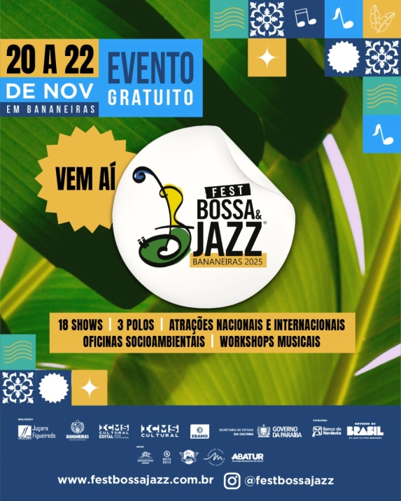 O Fest Bossa & Jazz Bananeiras 2025 confirmou mais quatro atrações que prometem encantar o público entre os dias 20 e 22 de novembro, no coração do Brejo Paraibano. Com programação totalmente gratuita, o festival valoriza a diversidade musical com 18 shows, reunindo artistas nacionais, internacionais e regionais em uma grande celebração da música.