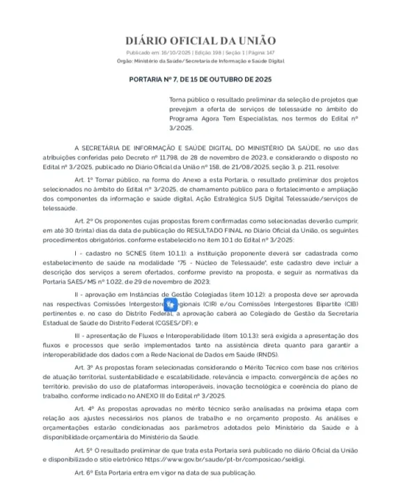 Ministério da Saúde publica Portaria e Piancó avança na oferta de serviços de Telessaúde pelo Programa “Agora Tem Especialistas”