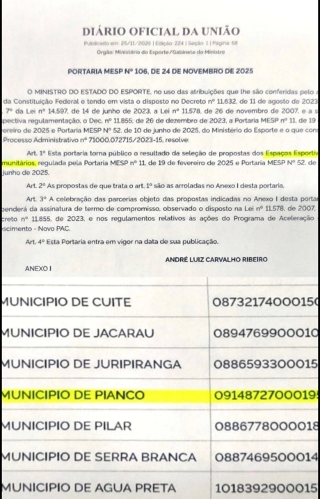 O município de Piancó acaba de conquistar mais um grande avanço para o lazer, o esporte e a convivência comunitária. O Ministério do Esporte publicou, no Diário Oficial da União de ontem (24/11), a Portaria MESP nº 106, que traz a lista das propostas selecionadas para a implantação de Espaços Esportivos Comunitários em todo o país — e Piancó está entre os contemplados.
