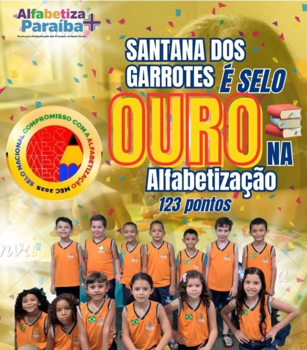 Santana dos Garrotes conquistou, pela primeira vez, o Selo Ouro em Alfabetização, alcançando a marca de 123 pontos no programa Alfabetiza + Paraíba. Esta importante conquista é resultado do compromisso da gestão municipal, do trabalho incansável dos professores, equipes escolares, Secretaria Municipal de Educação e do empenho dos alunos e suas famílias.