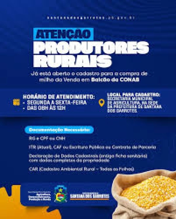 A Prefeitura Municipal de Santana dos Garrotes, confirma que já está aberto o cadastro para a compra de milho por meio da modalidade venda em balcão da CONAB.
