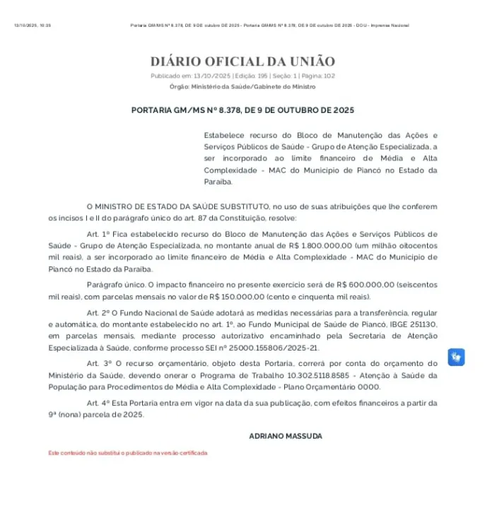 O senador Veneziano Vital do Rego, comemorou mais uma conquista importante para Piancó, que atenderá de melhor forma a população, como também, aumentará a oferta de serviços de imagem, a exemplo de tomografia, dentre outros exames e consultas, que após o aumento do teto de recursos para o custeio de saúde, através da portaria do Ministério da Saúde, Piancó poderá cuidar melhor ainda da sua população.