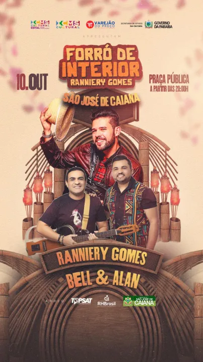 Programado para iniciar às 20 horas, o Forró de Interior, contará com uma grande estrutura de palco e som, em praça pública, para receber quatro atrações. Veja: